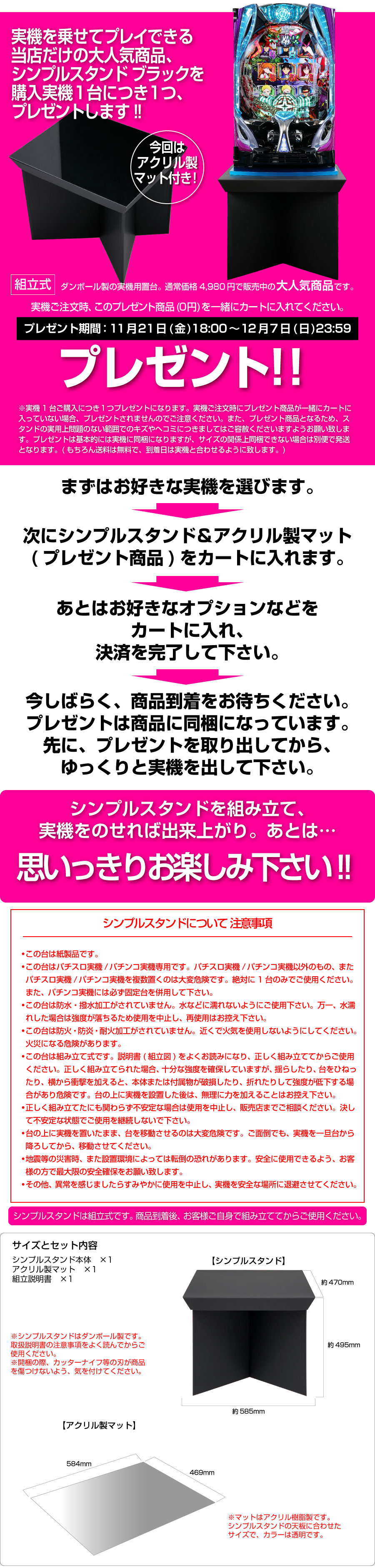 ・実機1台ご購入につき、シンプルスタンド(ブラック)・アクリル製マットを1セットプレゼントになります。