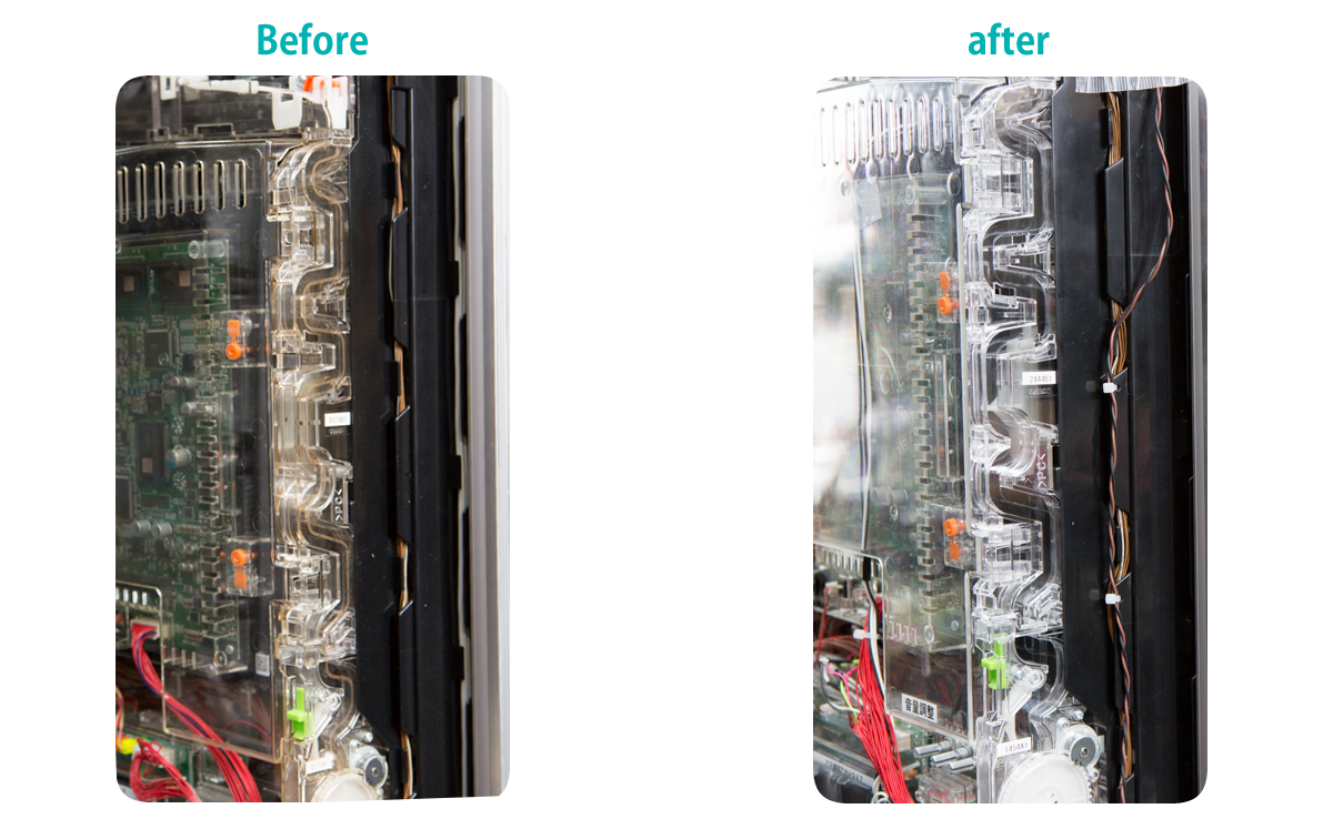 お客様に納得して頂ける美しいパチンコ機械をお届けするために、パーツを分解洗浄し、単に綺麗にするだけでなく、全体のコンディションをチェックしながら作業を行なっています。