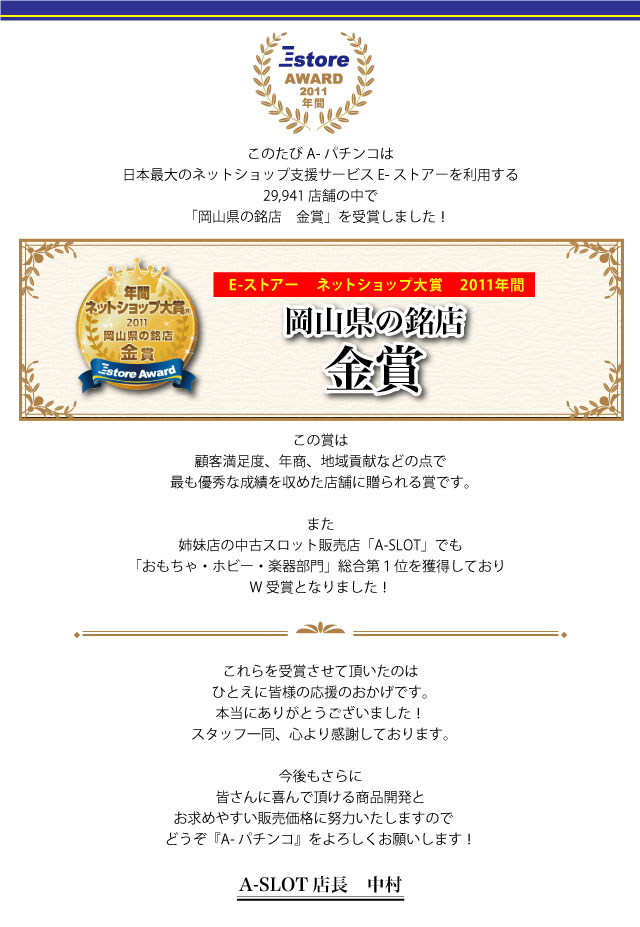 A-PACHINKO TOP 過去スタブロ2012年1~3月 Eーストアーアワード2011年間 岡山県の銘店 金賞受賞 過去スタブロ2012年1~3月 Eーストアーアワード2011年間 岡山県の銘店 金賞受賞 過去スタブロ2012年1~3月