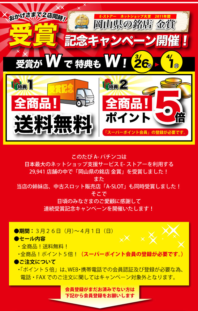 A-PACHINKO TOP 過去スタブロ2012年1~3月 ネットショップ大賞 受賞記念キャンペーン 3/26~4/1 過去スタブロ2012年1~3月 ネットショップ大賞 受賞記念キャンペーン 3/26~4/1 過去スタブロ2012年1~3月