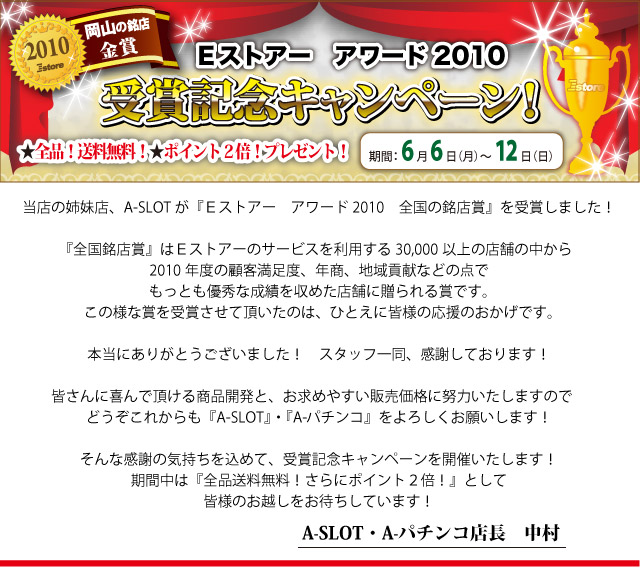 A-PACHINKO TOP 過去スタブロ2011年4~6月 『Eストアー アワード2010』受賞記念キャンペーン開催! 過去スタブロ2011年4~6月 『Eストアー アワード2010』受賞記念キャンペーン開催! 過去スタブロ2011年4~6月